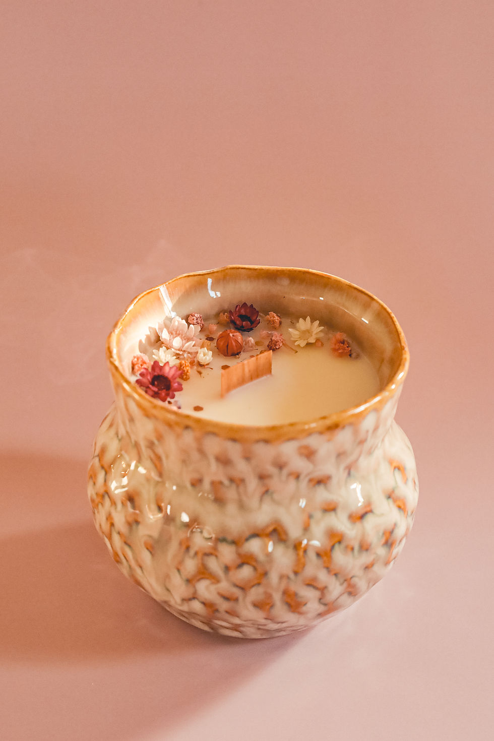 Bougie dans un contenant en céramique émaillé crème dégradé vers le marron décorée de fleurs séchées